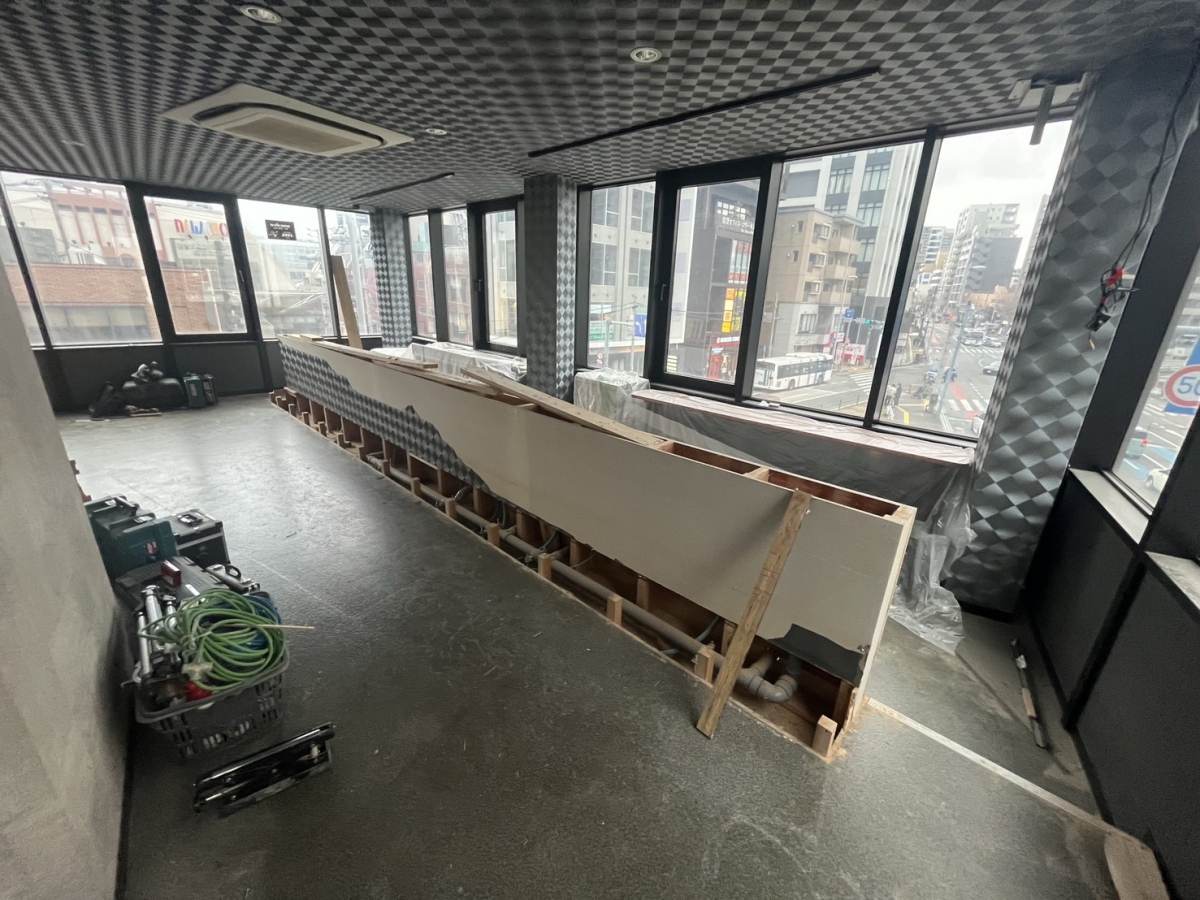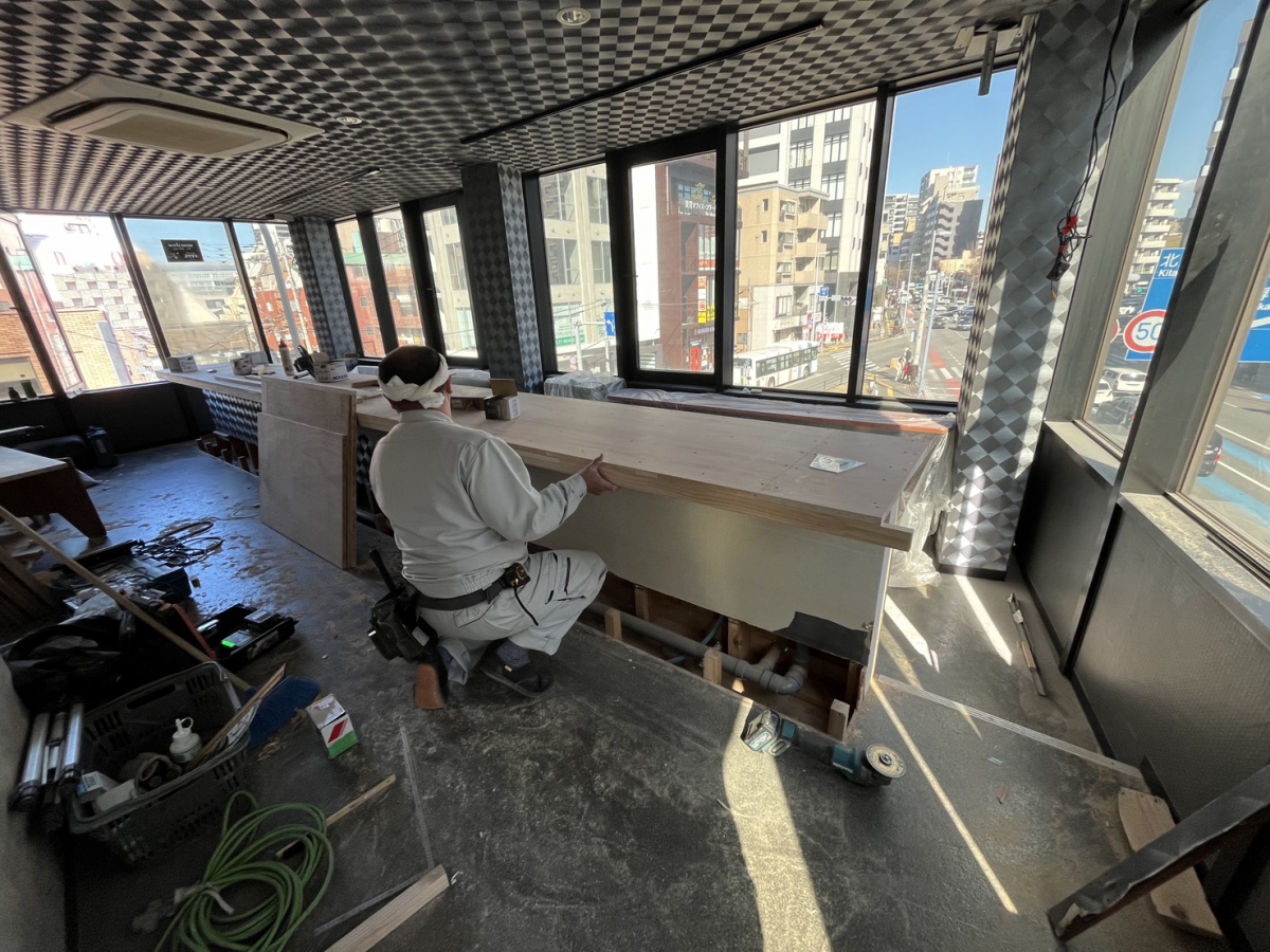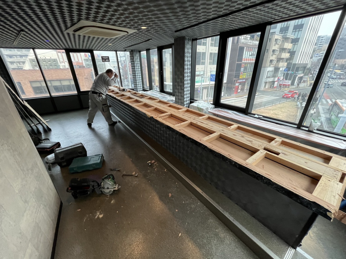 お知らせ Home お知らせ 福岡市某飲食店改修来工事 福岡市某飲食店改修来工事 2026.03.09 工事前 カウンターチェアー更新に伴い、カウンター天板とチェアーの高さが合わなくなるため、カウンター天板改修工事のご依頼をいただきました! 合わせてお店の雰囲気も既存を踏襲しつつ少しイメージチェンジとのご要望を頂きましたので、内装工事も行います! 工事中 既存天板の解体工事。足置きも不要になるので合わせて解体していきます。 天板解体後立ち上がり部の高さを調整します。 カウンター天板造作 工事完了 カウンター天板高さを約90㎜下げました!天板の面材もシートからメラミン材に変更しました! 壁紙・フロアタイルも一新しました! 前へ 次へ 一覧へ戻る